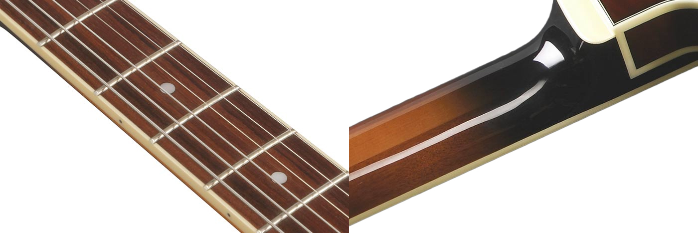 El corazón de la jugabilidad de esta Artcore reside en su mástil encolado de 3 piezas de Nyatoh y Arce. Esta combinación de maderas proporciona un rango medio-bajo rico y una resonancia excepcional que se siente en cada nota. Al contar con una escala de 28 pulgadas, este instrumento garantiza que mantenga una tensión ideal y una respuesta de frecuencia definida, evitando que el sonido se vuelva borroso en las afinaciones bajas. El diapasón de palisandro (Rosewood) con incrustaciones de bloques acrílicos equilibra el tono con medios enfocados y agudos suaves, permitiendo una ejecución técnica fluida que se traduce en una potencia real tanto en arpegios limpios como en líneas melódicas complejas.