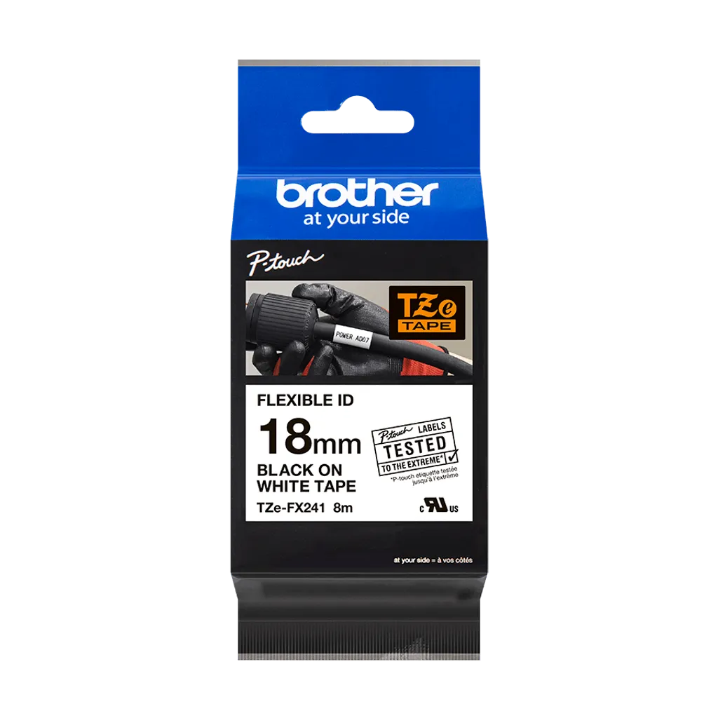 El Negro sobre blanco TZeFX241 flexible ID de cinta de Brother mide (18 mm x 8 m ). Proceso de cinta laminada es el Brother de la función de cinta y un adhesivo especialmente formulado que está diseñado para pegarse a sí misma o al laminado. La cinta es ideal para envolver alrededor de un artículo y . superficies etiquetado cilíndricas tales como cables, y tubería de PVC Además, se pueden utilizar para envolver alambre y cinta de señalización TZeFX241 flexible ID está diseñado para las siguientes impresoras.: