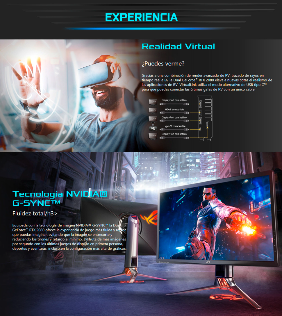 Equipada con la tecnología de imagen NVIDIA® G-SYNC™ la Dual GeForce® RTX 2080 ofrece la experiencia de juego más fluida y rápida que puedas imaginar, evitando que la imagen se entrecorte y reduciendo los tirones y retardo al mínimo. Disfruta de más imágenes por segundo con los últimos juegos de disparo en primera persona, deportes y aventuras, incluso en la configuración más alta de gráficos.