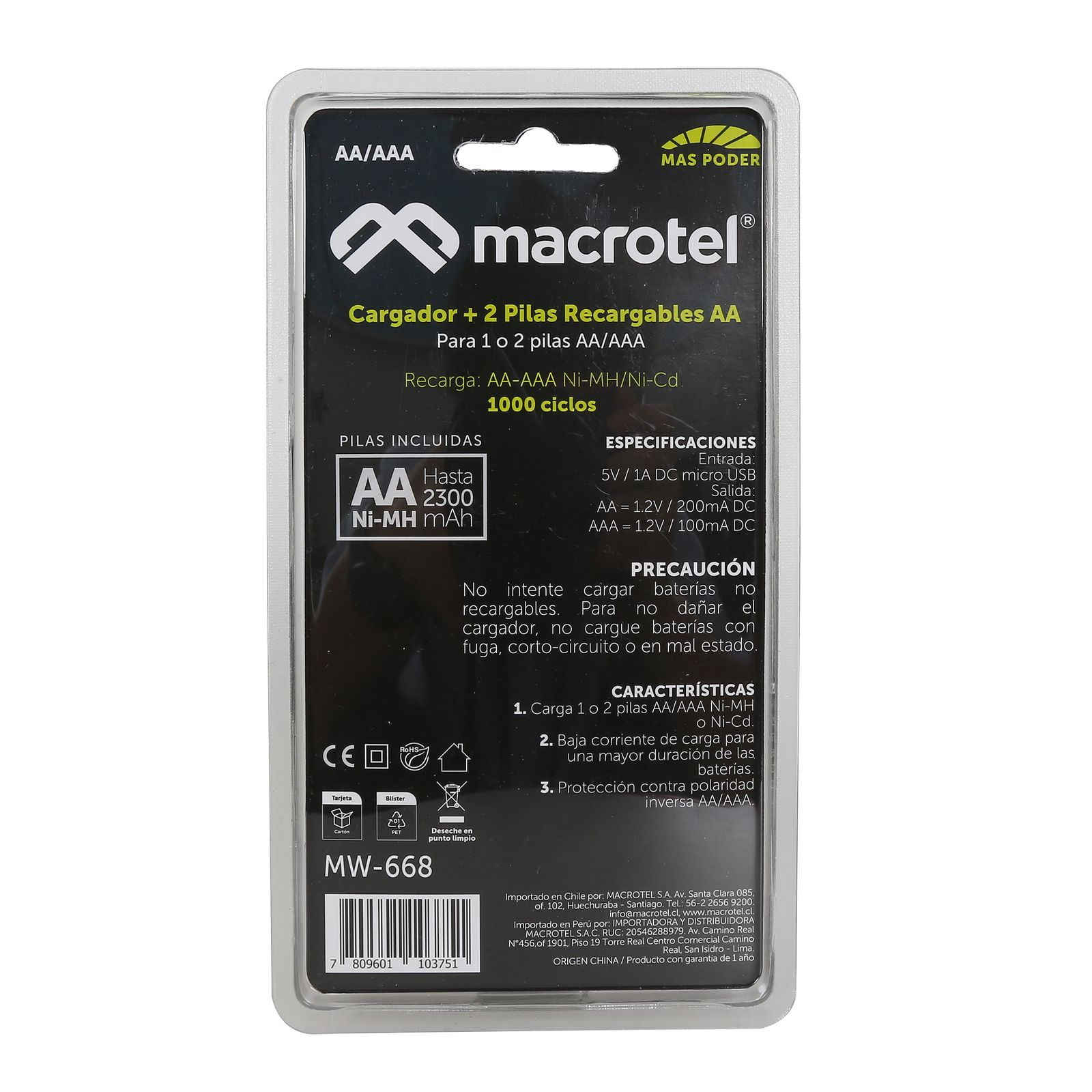 El cargador de pilas Macrotel es una solución versátil para mantener tus dispositivos electrónicos siempre operativos. Diseñado para cargar pilas recargables AA, AAA y baterías de 9V, este dispositivo permite cargar simultáneamente 2 pilas AA o AAA, o una batería de 9V. Incluye 2 pilas AA recargables de 2300mAh, ideales para un uso prolongado antes de requerir una nueva carga.