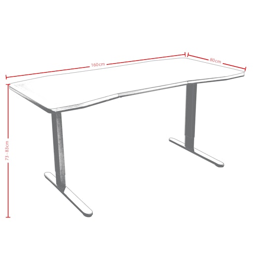 Sobre una base de acero sólida pero elegante descansa tres placas de 25 mm de espesor hechas de un MDF robusto con una superficie de efecto de fibra de carbono que evoca el aspecto y la sensación de la tela fina. El tablero de la mesa se puede cubrir con un tapete llamativo con una superficie de tela micro tejida diseñada para durabilidad. Se puede usar cualquier mouse con tipos de sensores comunes, por lo que una alfombrilla solo es necesaria por razones estéticas. Gracias a sus enormes dimensiones de 160 centímetros de largo y 80 centímetros de ancho, hay espacio suficiente para hasta tres monitores además del mouse y el teclado.