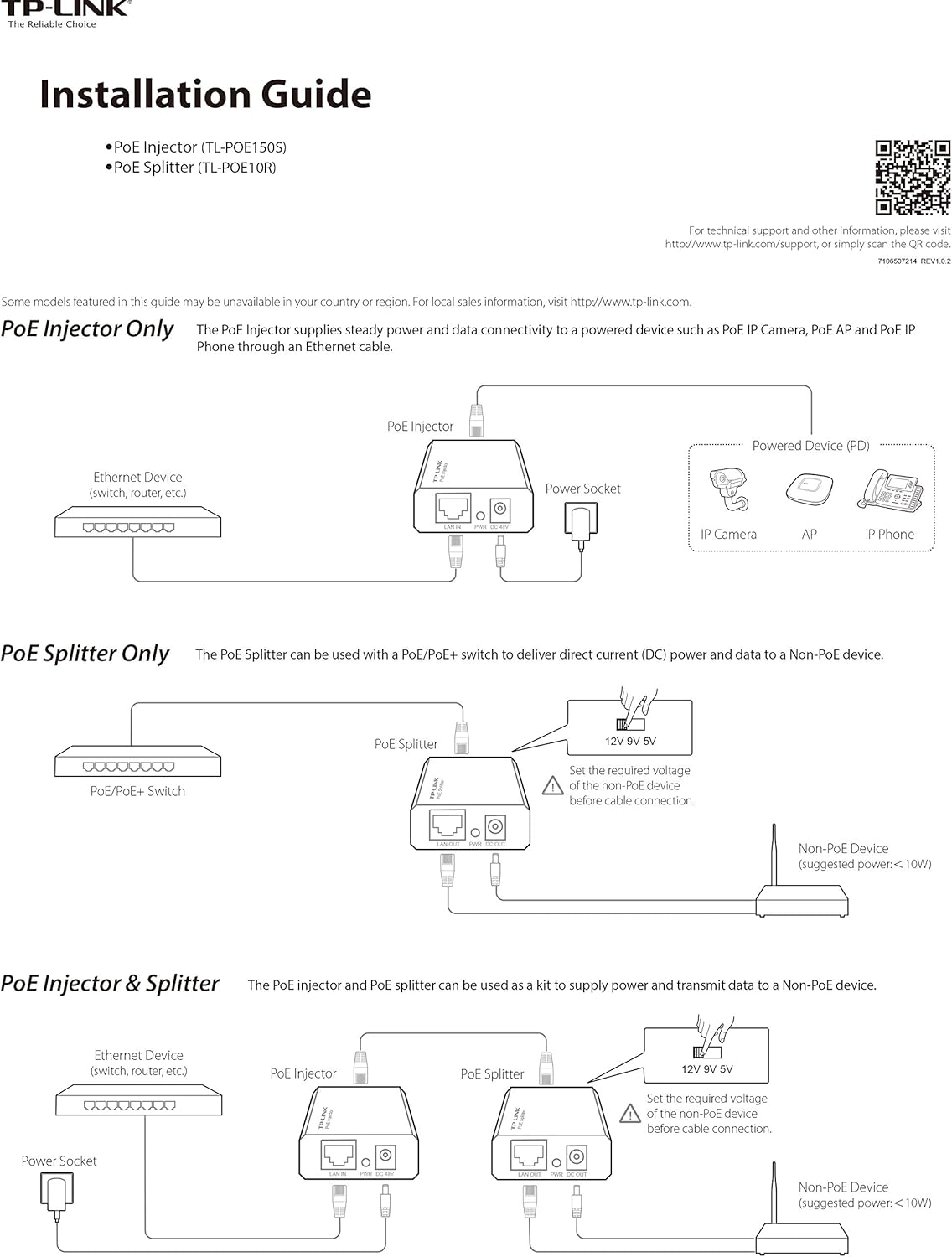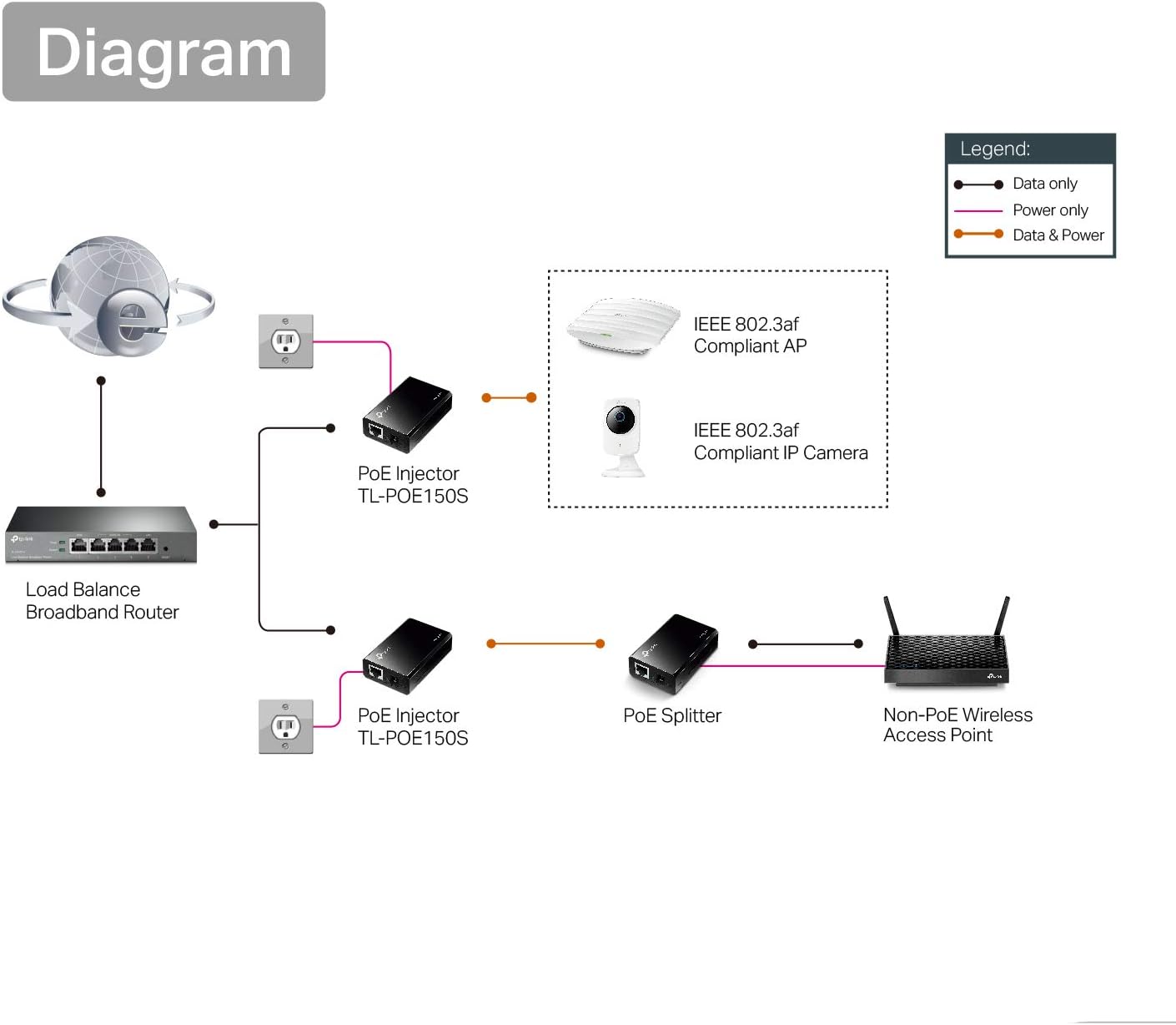 El inyector PoE TL-POE150S cumple por completo el estándar IEEE 802.3af y puede funcionar con todos los equipos PoE o adaptadores de recepción PoE compatibles con la norma IEEE 802.3af tales como el modelo TL-POE10R de TP-LINK u otros dispositivos equivalentes. De este modo, puede llevar la red a aquellos puntos en los que no existe suministro eléctrico y poder utilizar dispositivos tales como puntos de acceso y cámaras o teléfonos IP.